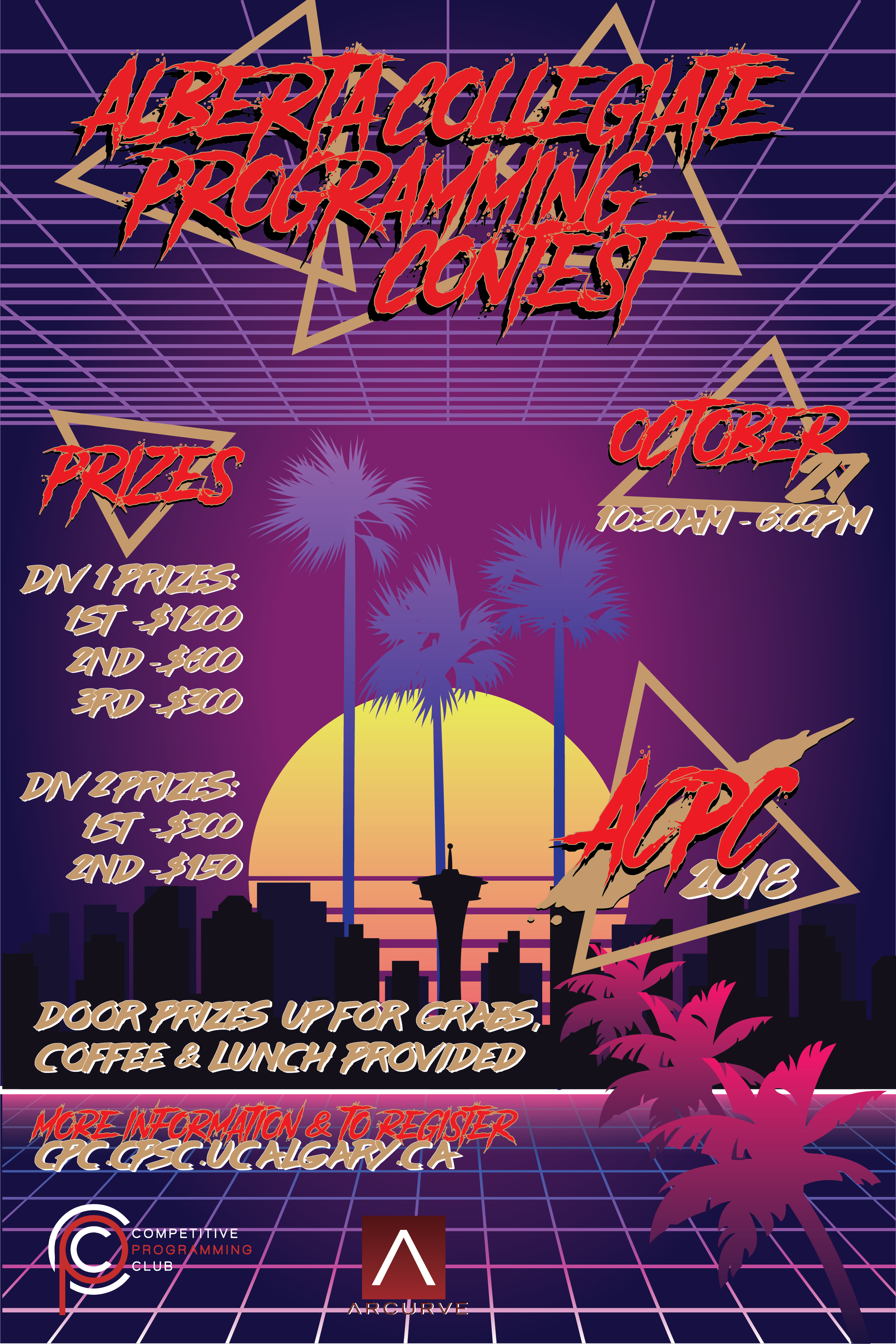 Competitive Programming Club (CPC) with the help of Arcuve as official sponsor, is once again hosting the Alberta Collegiate Programming Contest (ACPC). We hope you can join us this November 23rd from 10:00AM to 5:30PM. We will be serving coffee and lunch, and a talk by Arcurve. We have two divisions, so we strongly encourage first year students to test their skills in the contest.