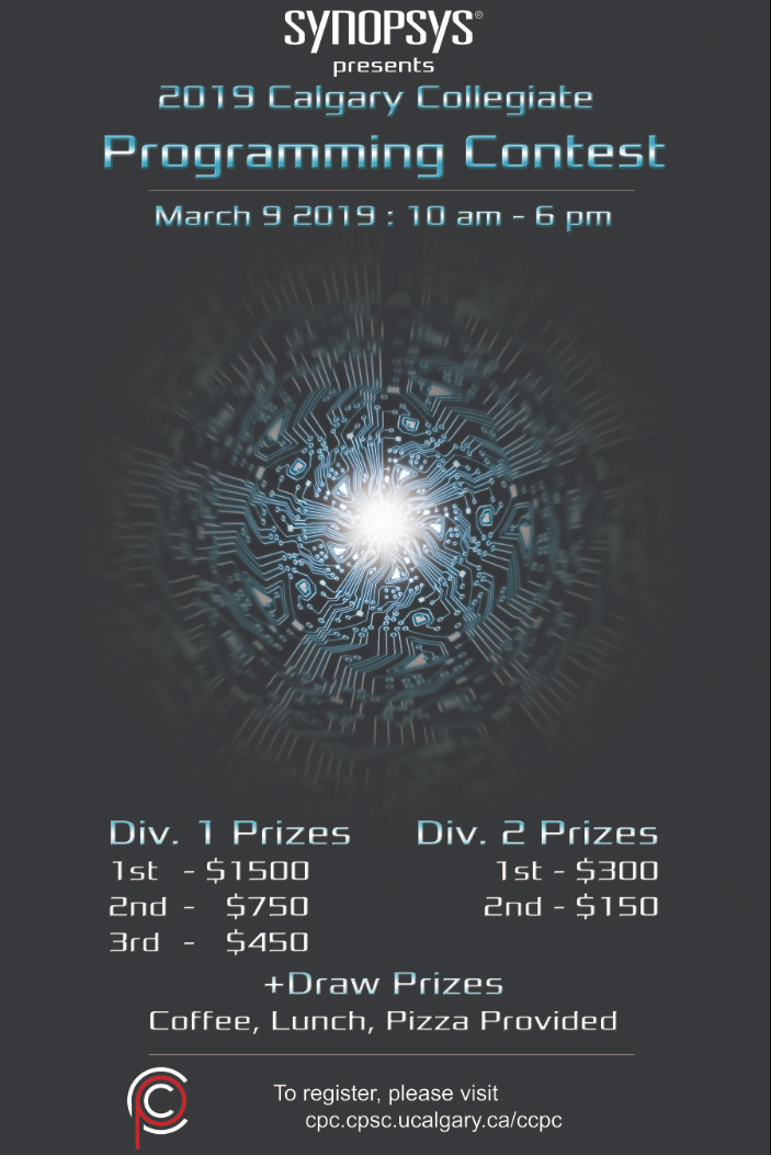 Welcome back to the winter semester! We are excited to announce that the Calgary Collegiate Programming Contest (CCPC) will take place on March 9, 2019. CCPC is hosted by us (CPC) along with the help of our official sponsor, Synopsys.