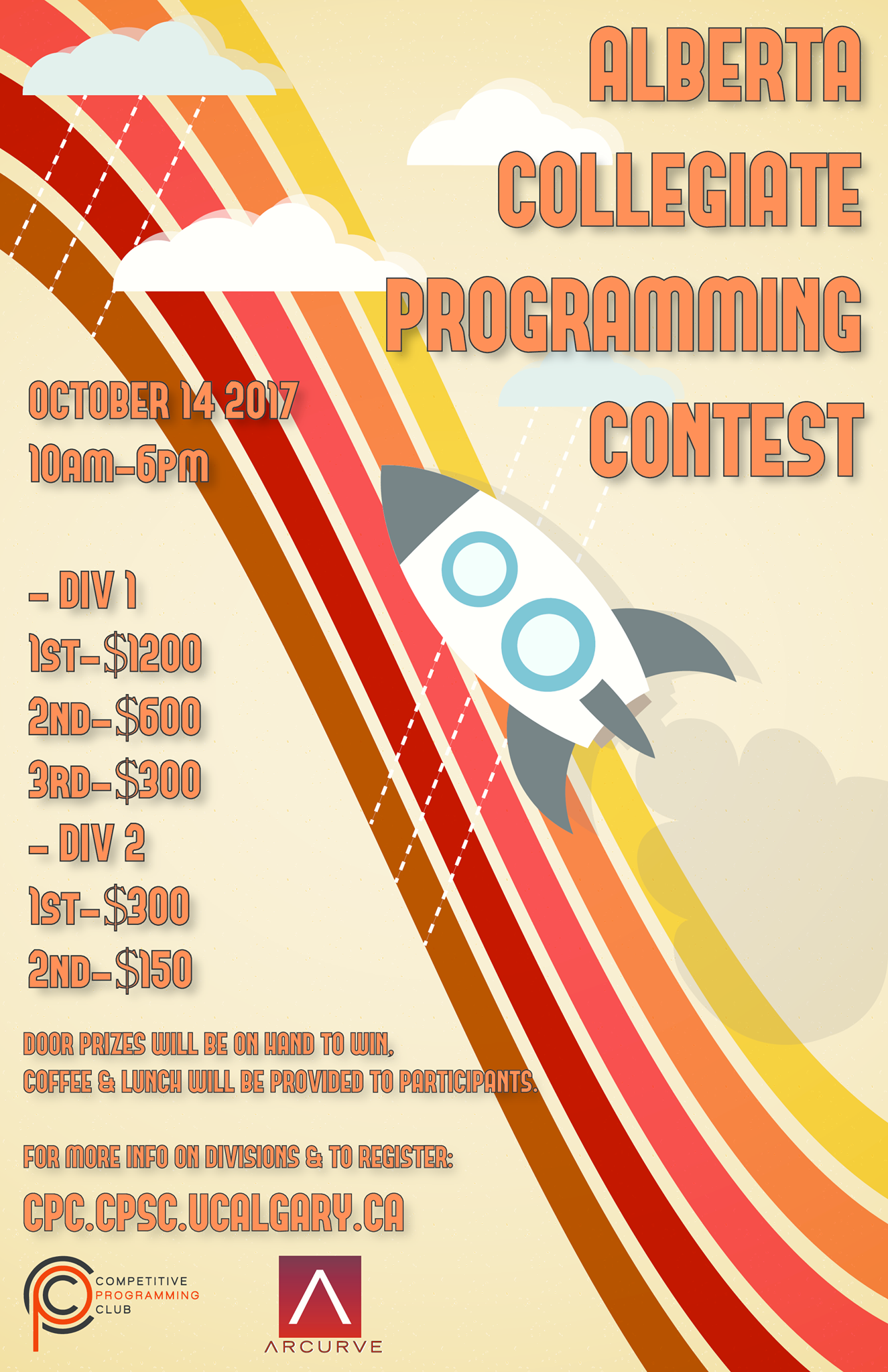 Competitive Programming Club (CPC) with the help of Arcuve as official sponsor, is once again hosting the Alberta Collegiate Programming Contest (ACPC). We hope you can join us this October 14th from 10AM to 6PM. We will be serving coffee and lunch, and a talk by Arcurve. We have two divisions, so we strongly encourage first year students to test their skills in the contest.