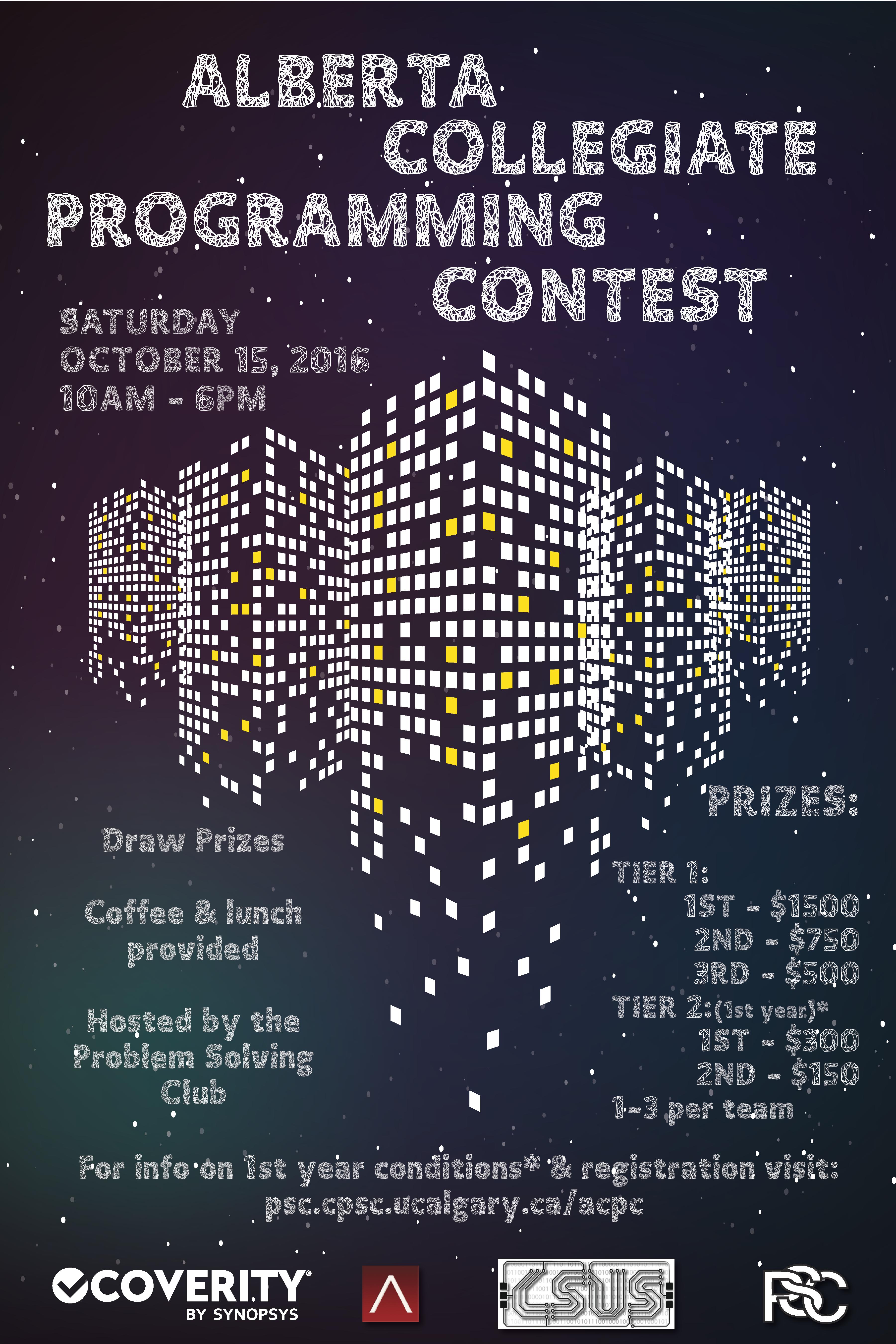 Registration for the ACPC is now open. We are hosting two divisions so all levels of experience are welcome. Space is limited, so sign up early! The deadline for signing up is Wednesday, October 12. A big thanks to Arcurve for sponsoring this contest.